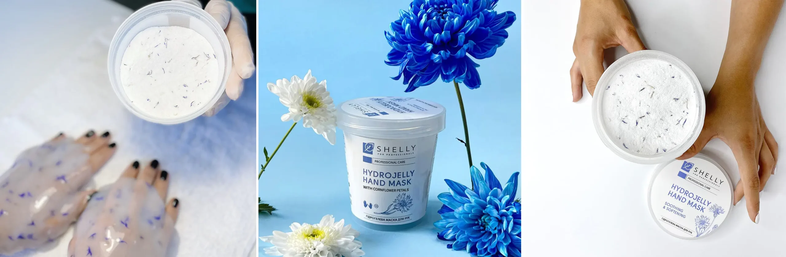 Diese innovative Hydrogelmaske vom Shelly mit Kornblumenblüten pflegt die Haut der Hände effektiv und lindert Irritationen und Rötungen. Das Produkt hat die Konsistenz eines Puders mit Kornblumenblüten. Bei Kontakt mit Wasser verwandelt es sich in ein homogenes, dickflüssiges Hydrogel. Die Maske härtet aus, und ihre Inhaltsstoffe beginnen aktiv zu wirken, indem sie in die tieferen Schichten der Epidermis eindringen.